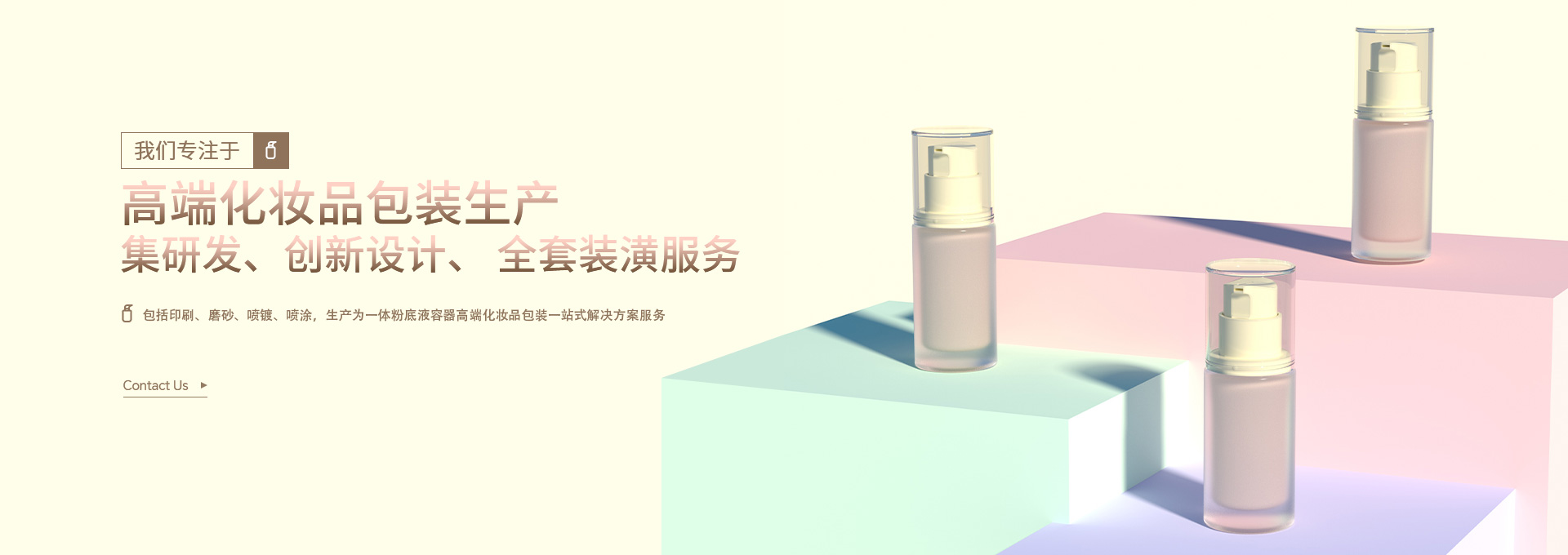 集研發、創新設計、 全套裝潢服務,包括印刷、磨砂、噴鍍、噴涂,生產為一體粉底液容器高端化妝品包裝一站式解決方案服務。